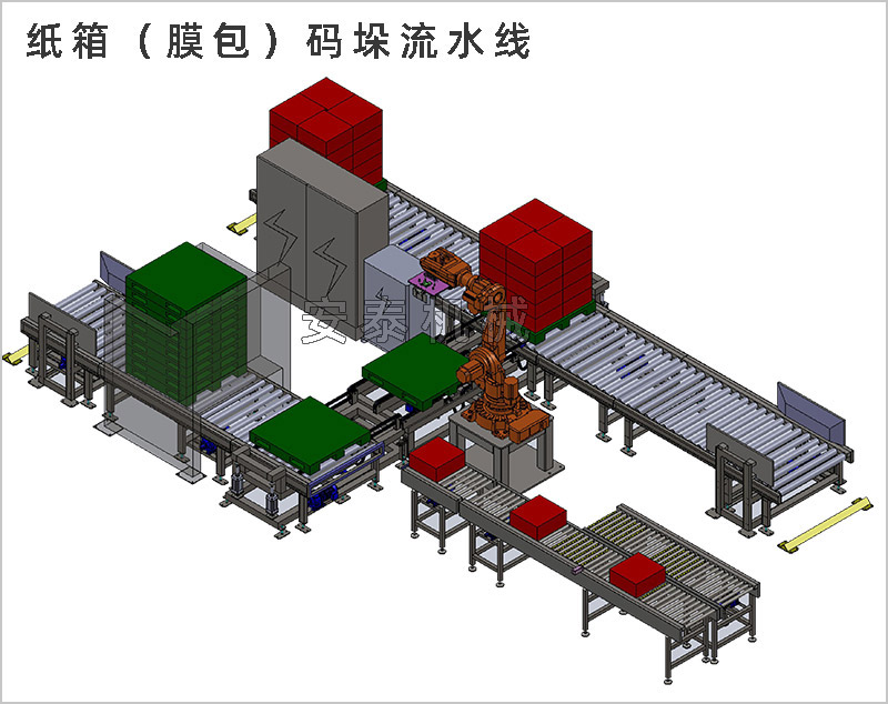 碼垛機是將已裝入容器的紙箱,按一定排列碼放在托盤、棧板(木質、塑膠)上,進行自動堆碼,可堆碼多層,然后推出,便于叉車運至倉庫儲存。本設備采用PLC+觸摸屏控制,實現(xiàn)智能化操作管理,簡便、易掌握。可大大地減少勞動力和降低勞動強度。碼垛機是輸送機輸送來的料袋、紙箱或是其它包裝材料按照客戶工藝要求的工作方式自動堆疊成垛,并將成垛的物料進行輸送的設備。